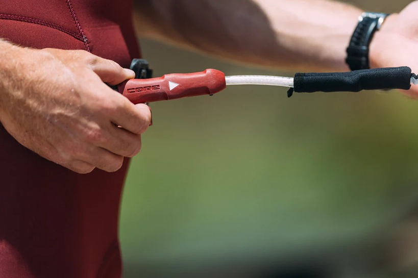 Till skillnad från en wrist leash sker kopplingen till vingen inte via en ögla utan med ett metallfäste som hakas i vingens leash-loop. Det gör systemet både mycket säkert och snabbt att koppla i och ur – så att du är redo på några sekunder och enkelt kan byta storlek på vingen.