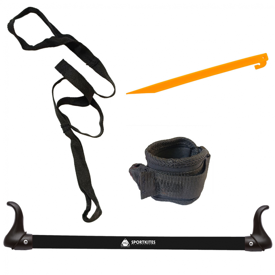 Levereras komplett “Ready to Fly”-utrustad med linor monterade på en sportig 2-linjers controlbar, safety leash och markankare inkluderat.